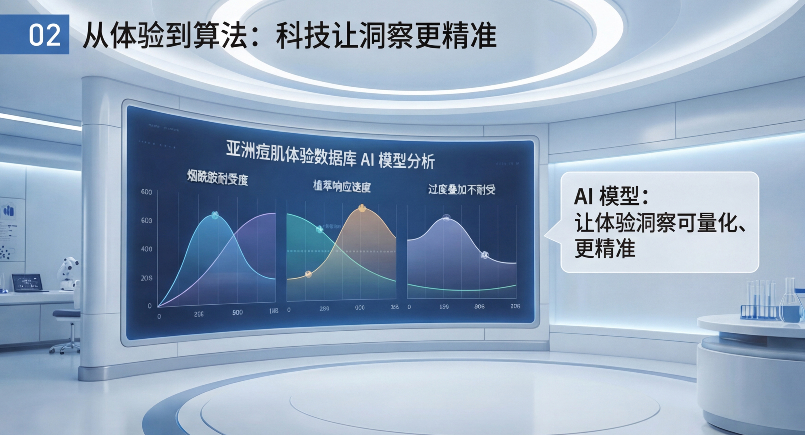 为了让体验洞察系统化、可量化、可重复,DRDM建立了独有的 亚洲痘肌体验数据库,由AI模型自动分析用户行为路径、产品响应速度与改善曲线。