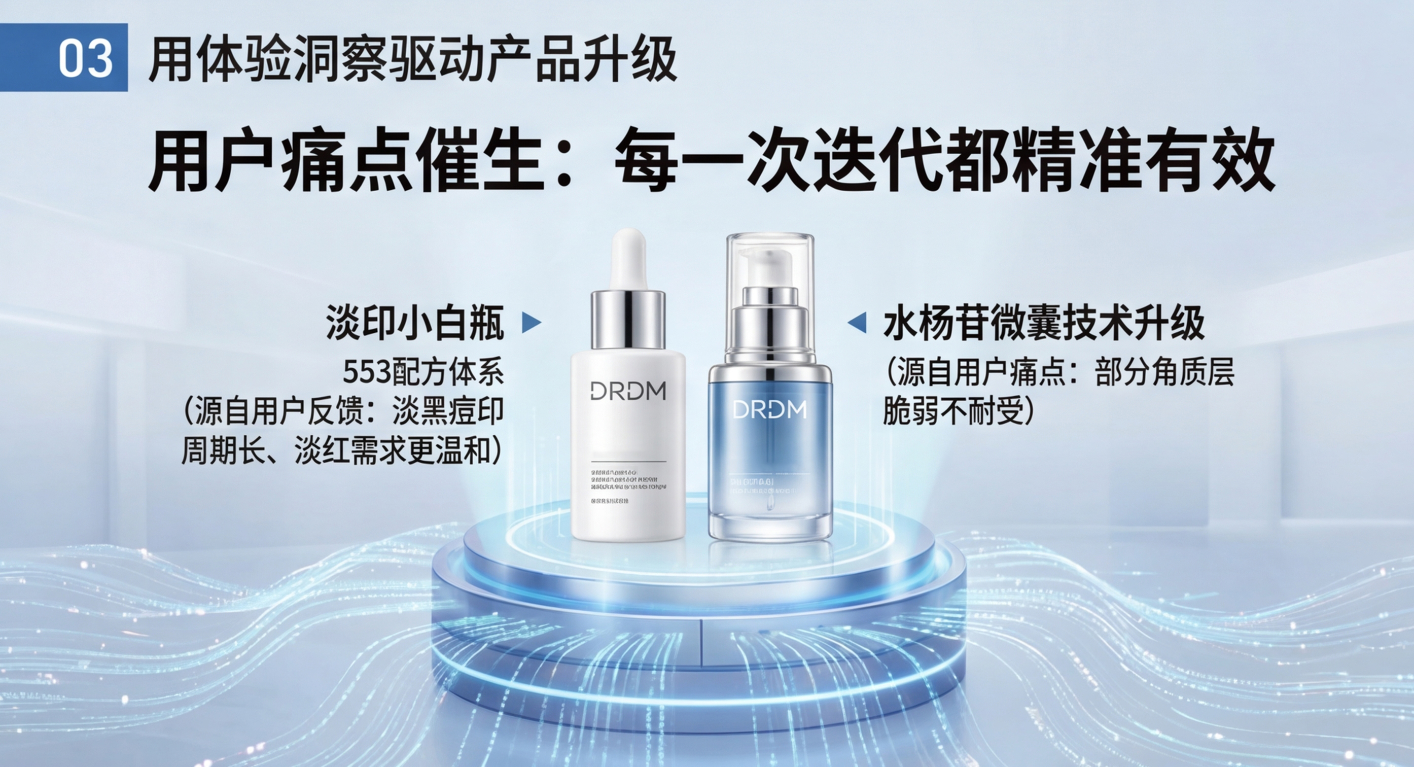 通过护肤顾问体系、大数据分析与用户行为研究,DRDM能够从海量用户反馈中精准识别: